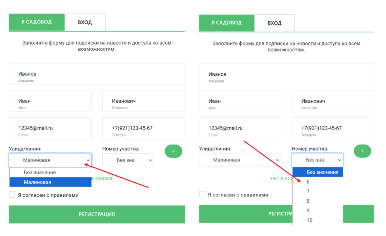 5. После того как вы создали улицы и номера участков, ваши садоводы при регистрации смогут выбрать из выпадающего списка свою улицу и свой участок.