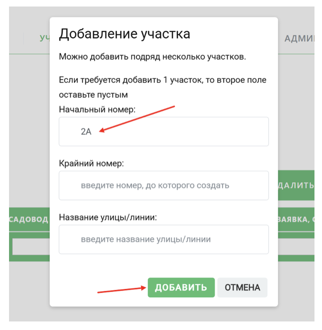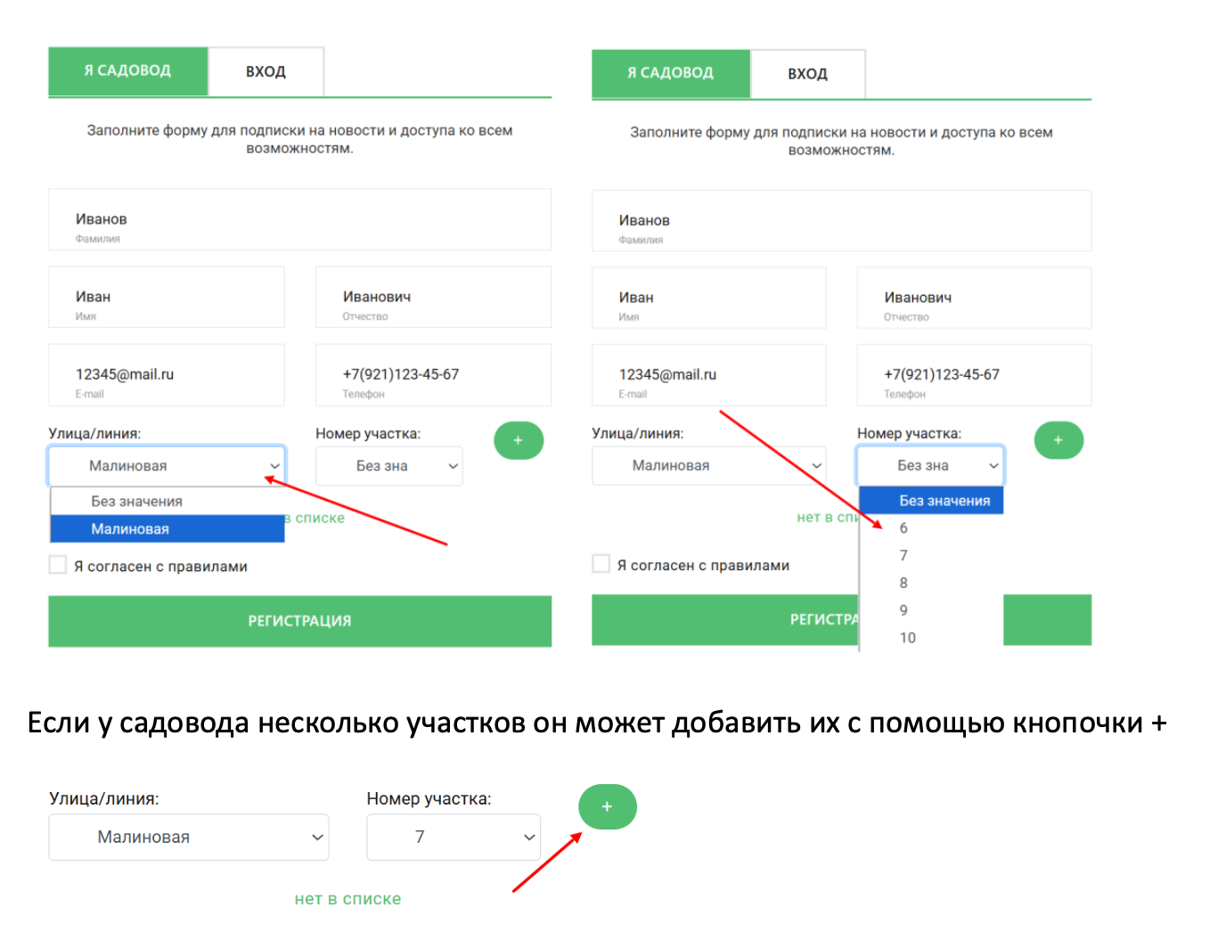 После того как вы создадите улицы и номера участков, при регистрации, вашем садоводам будет предоставлен выпадающие список где они смогут выбрать свою улицу и свой номер участка.