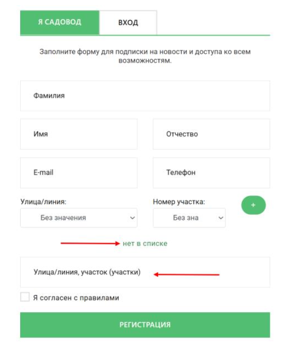6. Если Вы еще не создавали участки, а садоводы уже регистрируются, то им необходимо добавить свой участок через кнопочку «нет в списке»: